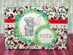 У меня сложился календарик на 2012 год - давно хотела совместить 2 любимых темы - скрап и мишек MeToYoy - вот наконец представился случай =) На фото мягкая обложка календаря ( размер 13*18 см ) - в основе 1,5 мм картон, также использовала ткань, атласную ленту, тесьму с помпонами, вырубки на сиззиксе из бумаги с бархатным узором, распечатанные картинки мишки и цифры 2012, вощеный шнур.