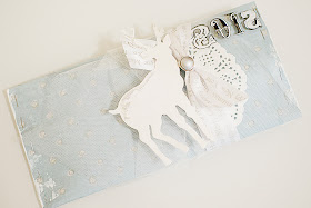 Упаковала подарочек для Мамы. Использовала скрапбумагу DoverCraft Let it snow, высечку с резист эффектом Prima, ленту с принтом, брадс, акриловую краску, пленку, натирки, серебряный глиттер, сетку, салфетку.